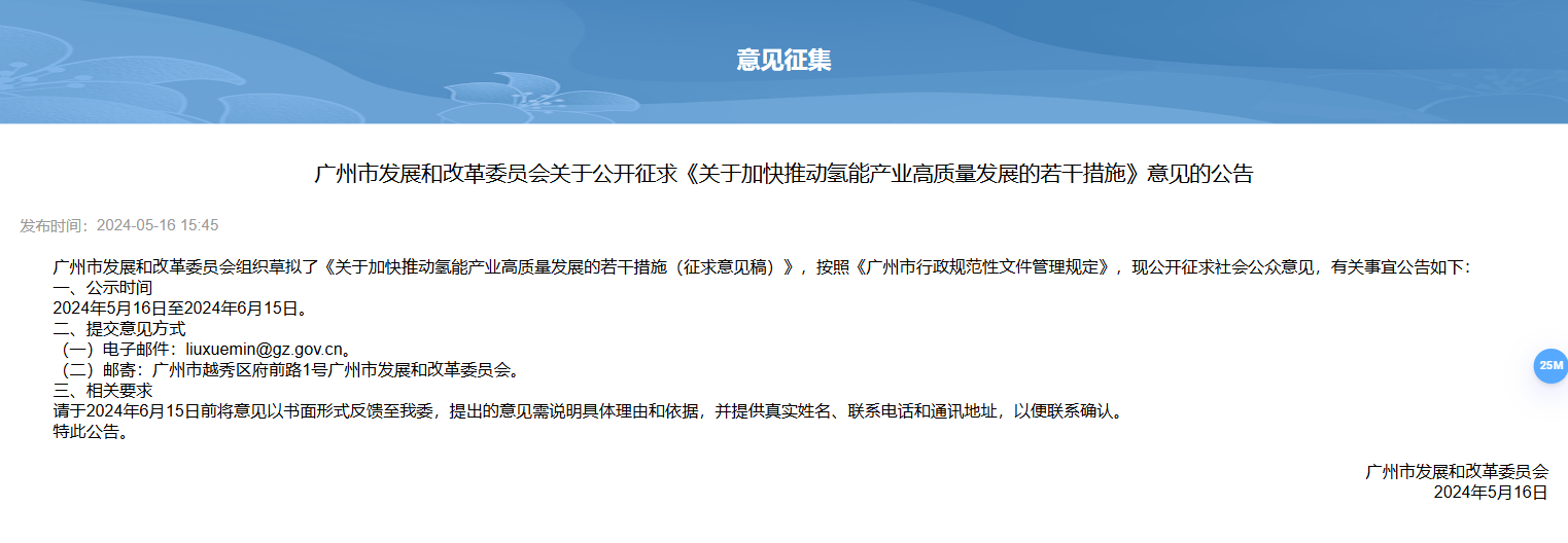 5月16日,廣州市發展和改革委員會發布公開征求《關于加快推動氫能產業高質量發展的若干措施》意見的公告,其中指出:因地制宜布局燃料電池分布式熱電聯供設施,建設固體氧化物燃料電池(SOFC)、質子交換膜燃料電池(PEMFC)等發電系統,推動在社區、園區、礦區、港口等區域內開展氫能源綜合利用示范,鼓勵結合新建和改造通訊基站工程開展燃料電池通信基站備用電源示范應用,探索開展氫能動力船舶應用,市級財政按照1000元/千瓦標準進行獎勵,每個項目不超過1000萬元。