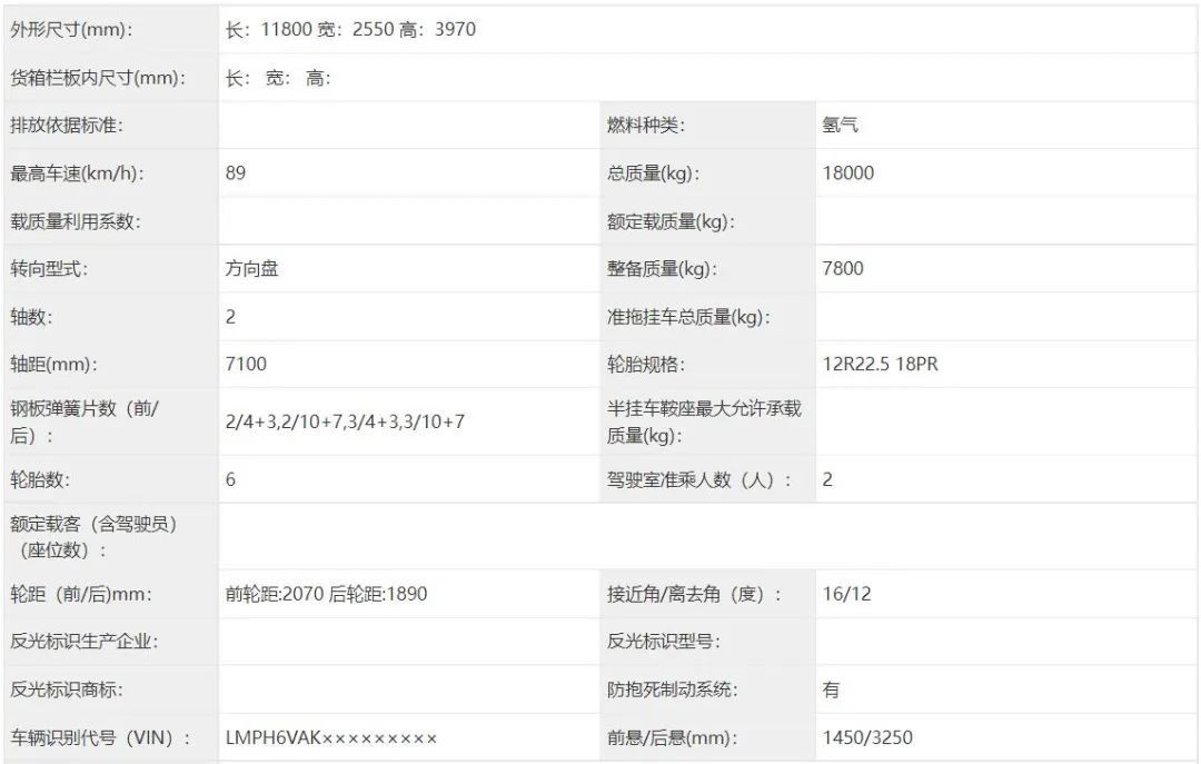The public information shows that the remote new methanol reforming hydrogen production cargo chassis product model DNC1188FCEVGMPJ1, shape size 1180025503970mm, wheelbase 7100mm. The total mass is 18000kg and the preparation mass is 7800kg.