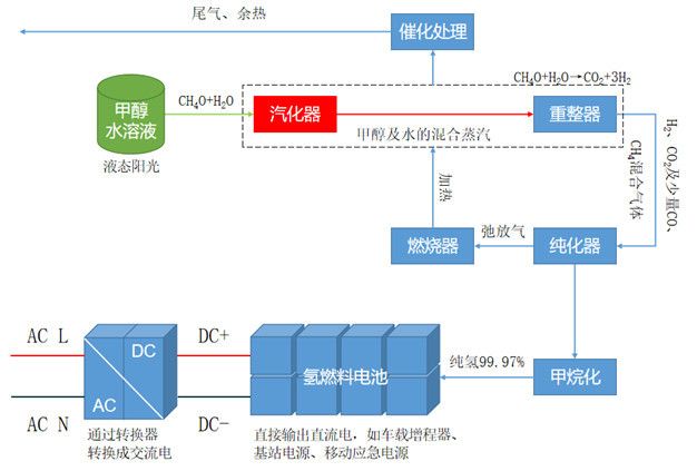 The methanol water mixture is gasified, enters the reforming room and is converted into hydrogen-rich reforming gas, and then enters the purification module to generate pure hydrogen. Then the pure hydrogen enters the low-temperature fuel cell. The hydrogen electrochemically reacts with the air (oxygen) to form a current, which continuously supplies power to the outside.
