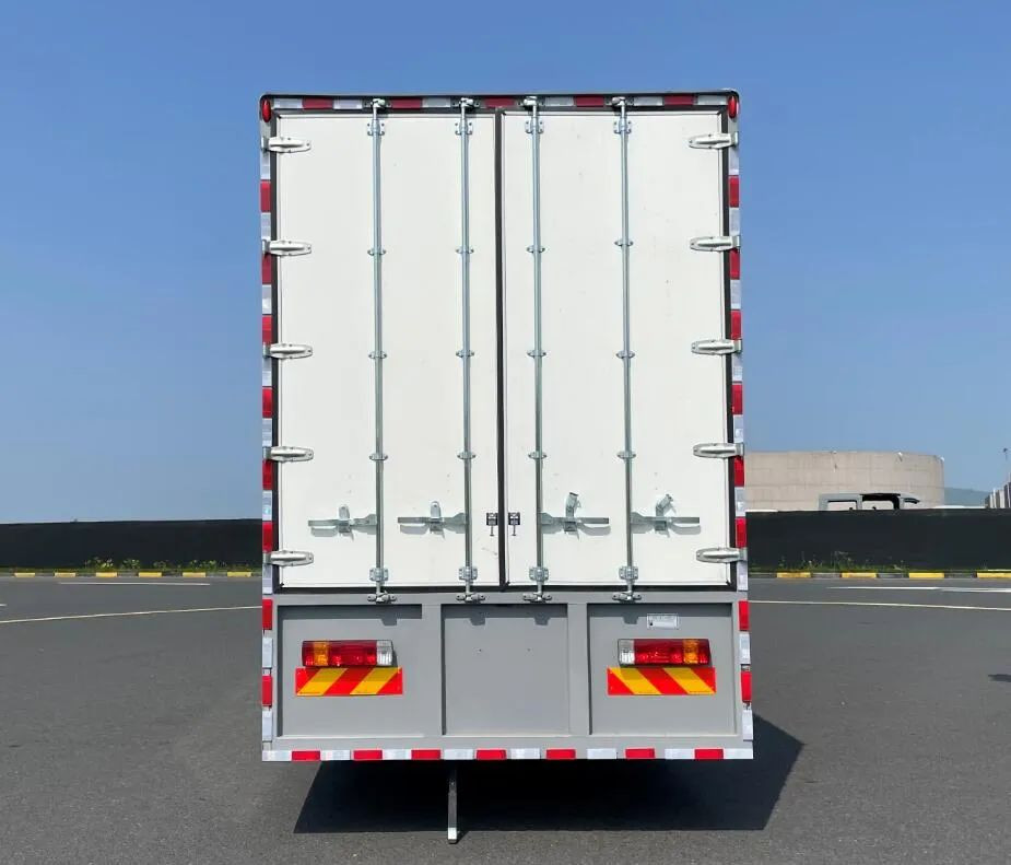 In other aspects, the top of the vehicle compartment is closed and cannot be opened, and the side protection is a skirt edge structure, symmetrical. The material used for the side protection is Q235A + thermoplastic glass fiber reinforced honeycomb plate, with a bolted connection mode. The rear protection is the skirt edge structure, the rear protection material is Q235A, the connection mode is welding, the rear protection is 480mm from the ground height, and can be charged externally.